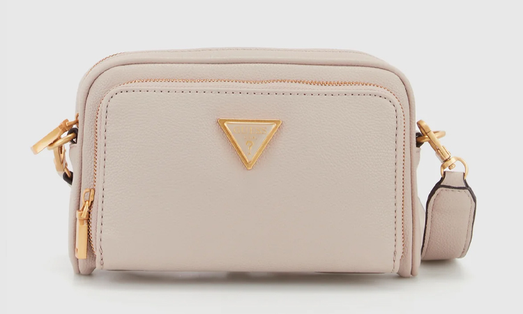 The adjustable chain crossbody strap offers versatile styling options, while the gold hardware adds a touch of elegance. Inside, an internal zip pocket keeps belongings organized, and the secure zip closure ensures peace of mind on the go. This Guess bag is the perfect blend of sophistication and practicality for the modern trendsetter. Available in only two colors black, and taupe.